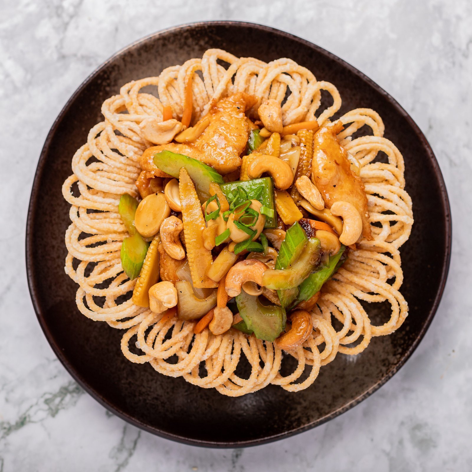 Base de fideos fritos en forma de nido con pollo, vegetales mixtos y pepitas de marañon.
