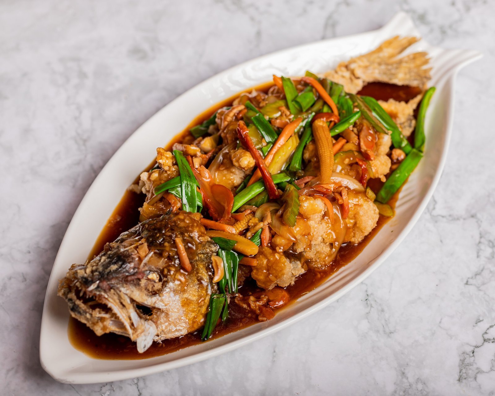 Pescado entero frito y laqueado, bañado en salsa de frijol negro de la casa.