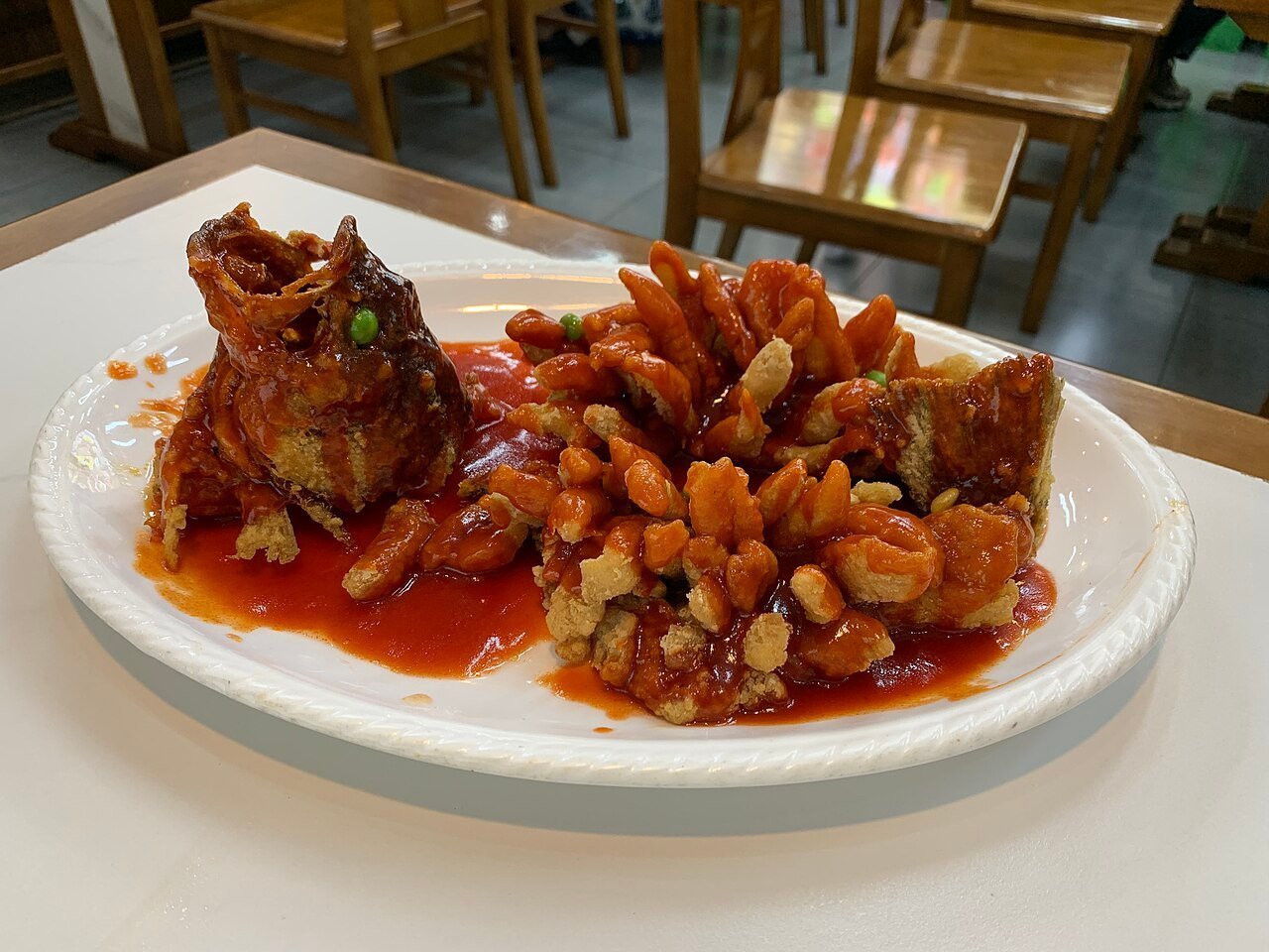 Pescado entero frito y laqueado, bañado en salsa hong siu de la casa.