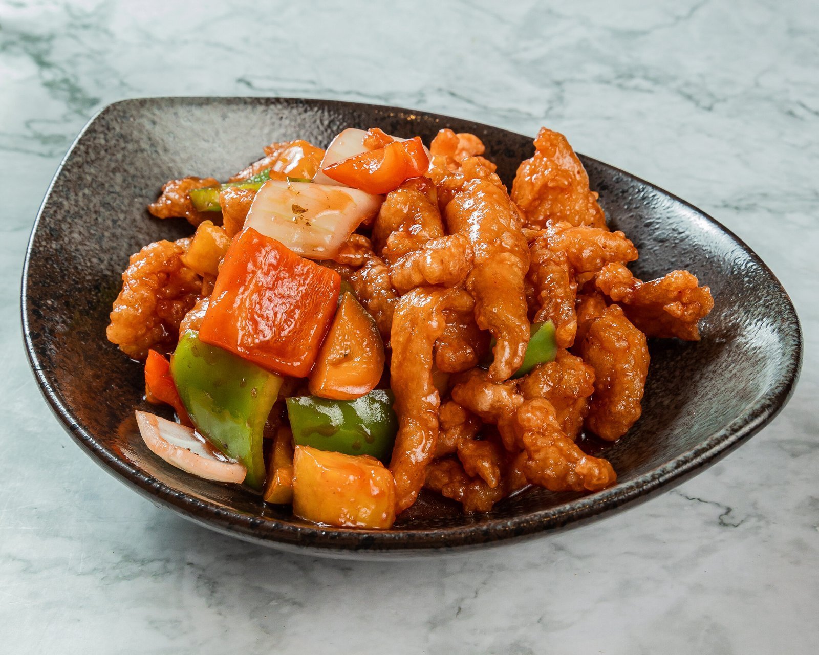 Trocitos de pollo salteado en wok con piña, cebolla y salsa agridulce.